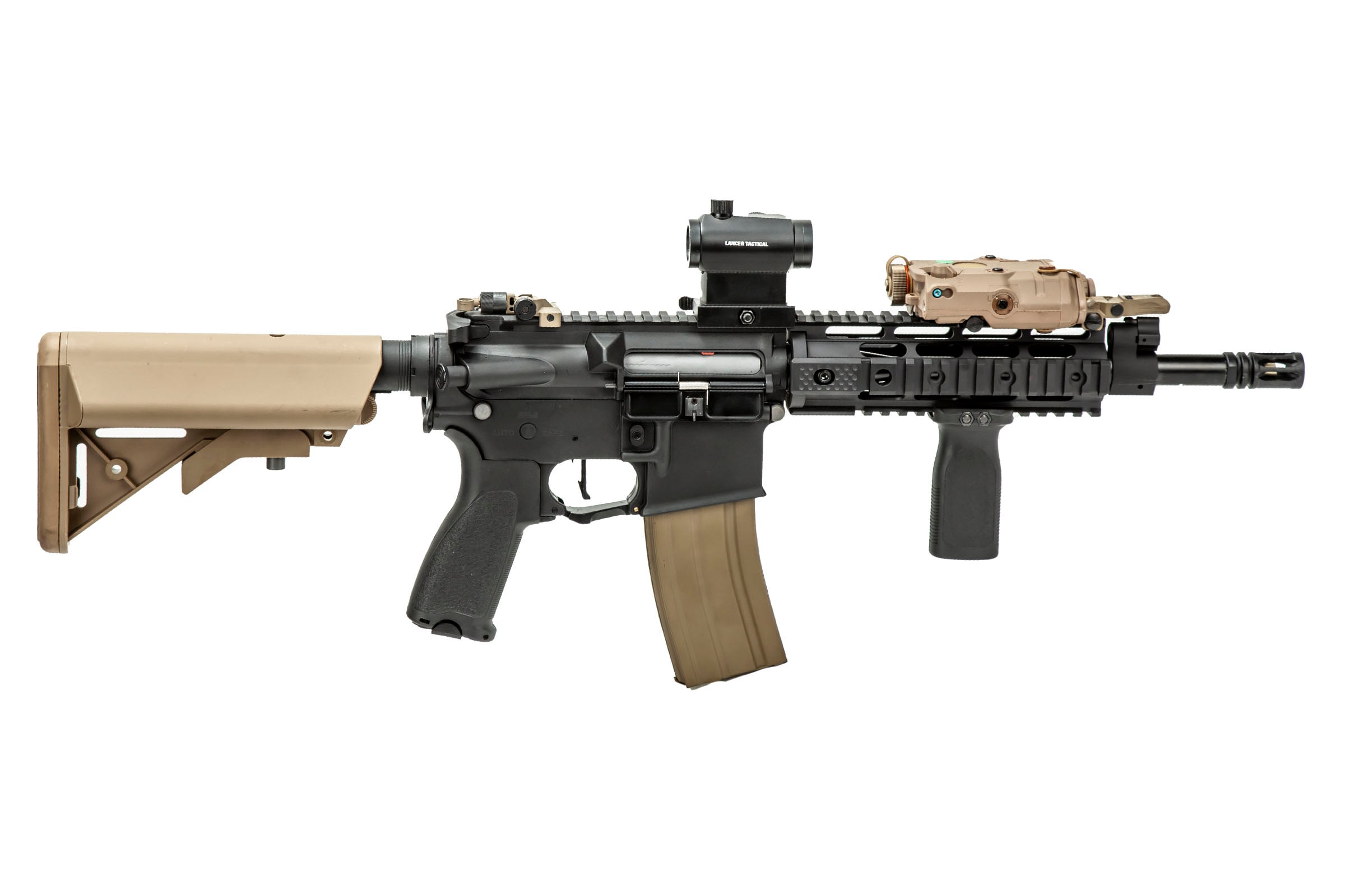 This custom was built around a Lancer Tactical LT-02 Hybrid Gen2 MK18. Starting off the list of upgrades are a new We Tech metal Bird Cage flash hider attached to a D Boy Outer barrel with a Madbull Airsoft Gemtech 7" Talon Rail System surrounding it. TO keep things comfy, we added a Magpul USA vertical grip, a classic grip that still proudly serves it users. Atop the rail sits a Tac 9 PEQ box that works in tandem with a Lancer Tactical Mini Red & Green Dot Sight to keep you on target at all times regardless of the lighting situation.