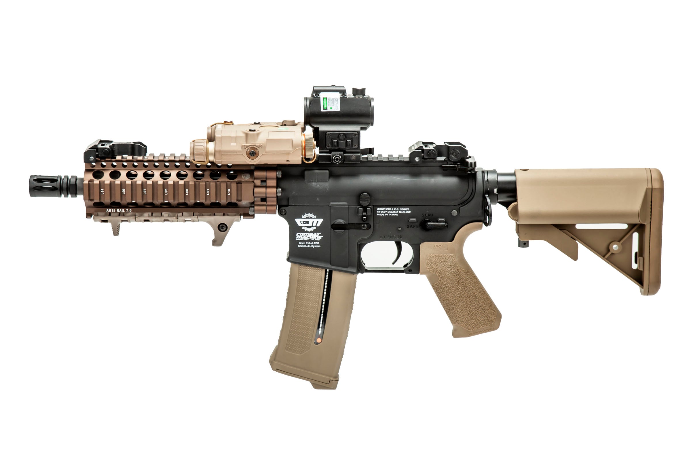 We've started by taking the venerable G&G R8-L, and removing the "L" from the equation entirely. We've replaced the original plastic rail with a SOCOM Gear Daniel defense 7" RAS in Flat Dark earth, adjusted the barrel length with a madbull extension and swapped in the awesome Elite Force QRS Motor grip in a matching tan. You'll find the back end replaced with a PDW stock as well. On the rail we have included a Bravo Airsoft P15 light and laser combo, handstop, and VISM Micro Blue/Red dot optic onto the gun as well. You'll feed this beast from the included PTS EPM1 250 round magazine, and store the whol package inside of the included 28" gun bag!