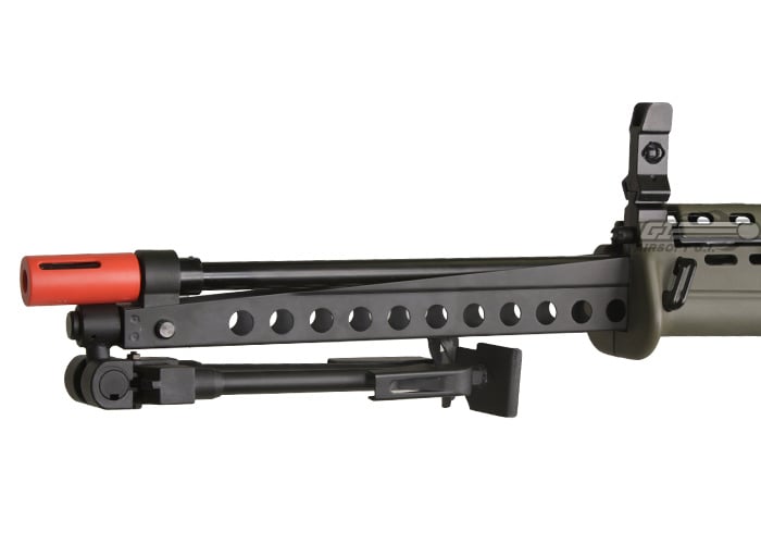 The ARES Full Metal L86A2 LSW is a new breed of support airsoft gun. It keeps the same basic characteristics of the L85, like the bullpup design, carry handle and iron sights. However the little things that have been changed make a world of difference. The barrel has been extended and is followed by a metal shroud to keep it sturdy. Mounted on the underside of the shroud is the adjustable bipod. On the flip side of the gun is a built in vertical grip, behind the magazine for stability in the prone position. Additionally, on the butt pad is a wire folding shoulder rest. This is a great replication of the famous British military support and long range weapon; it features a full metal body and gearbox. Nobody can replicate airsoft guns quite like Ares can.