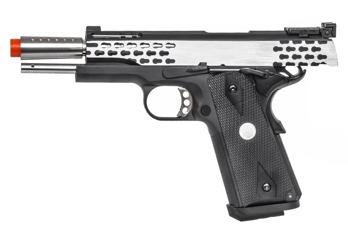 The Army Armament Full Metal R30-2Y 1911 Gas Blowback Airsoft Pistol comes with a silver slide that has unique KeyMod style slide serrations and ports. The lightening ported slide exposes the silver V12 outer barrel for everyone to admire. Set the safety with either hand due to its ambidextrous safety switch. Altogether, the R30 1911 is a unique airsoft that you can bring along with you for your next match up.