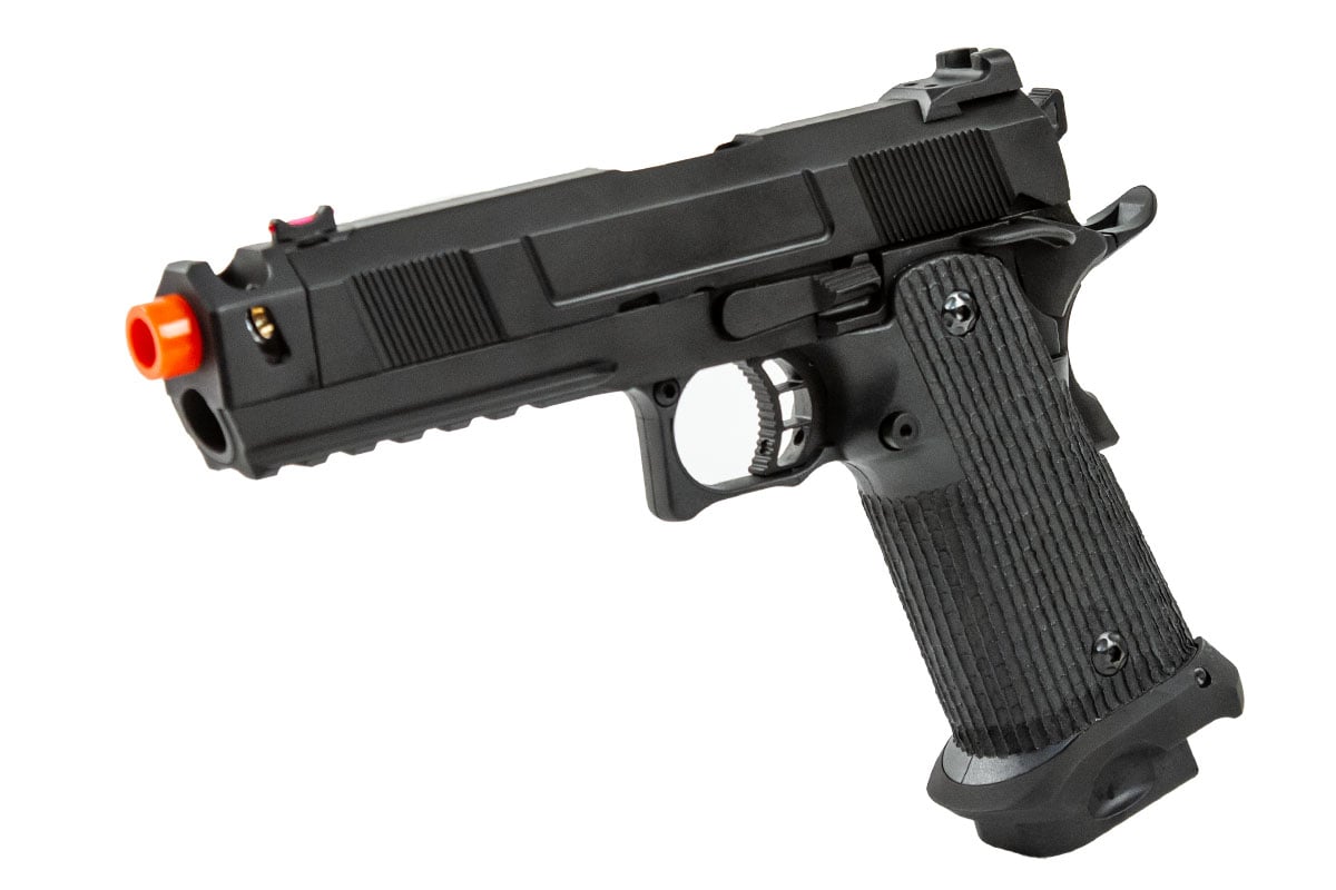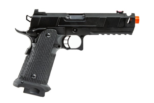 The Army Armament R501 has changed the game for the Hi-Capa world. All of the features you get from the R501 would normally be seen on a upgraded Hi-Capa. The stylish and aggressive slide draw the eyes in and add functionality to this airsoft pistol. The compensator keeps the barrel stable, adding to the accuracy of this gun. The fiber optic front sight tracker is easy for the eyes to grab and make target acquisition a breeze! Don't forget that the R510 is completely TM compatible! So you can do whatever you want to this hi-capa!