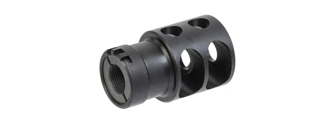 Introducing the Atlas Custom Works 14mm & 24mm Muzzle Brake, the perfect addition to your firearm. Constructed with heavy-duty steel, this muzzle brake is built to last. With threading options of 14mm and 24mm, it's compatible with a wide range of airsoft gun. The precision machining ensures accuracy and consistency in your shots, while the full metal construction provides durability and a lightweight design. Weighing in at only 5 ounces, you won't even notice it's there. The 14mm threaded barrel is compatible with the included adapter, allowing for easy installation. Upgrade your firearm's performance with the Atlas Custom Works 14mm & 24mm Muzzle Brake today..