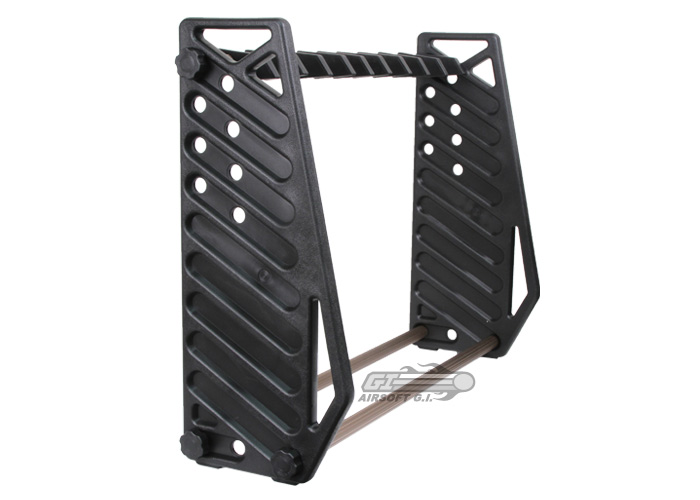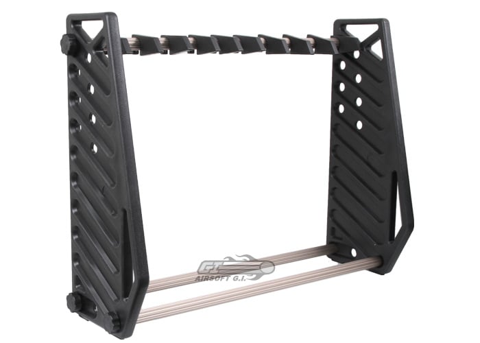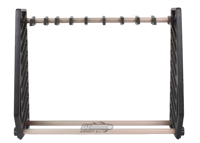 Gun Rack. I believe it gives you 10 positions to fit your guns but if you evenly space all the plastic tabs but with the width of the average gun you can only get 8 to 9 gun in the rack. The rack itself is built and constructed well. you can even pick up the whole rack with all the guns in it if you want to and there is no sign of bending or breaking. Depending on your gun, sometimes the butt of your rifle does not fit into the bottom of the rack. I recommend anyone get this who has 6-7 guns and wants to display them nicely.
