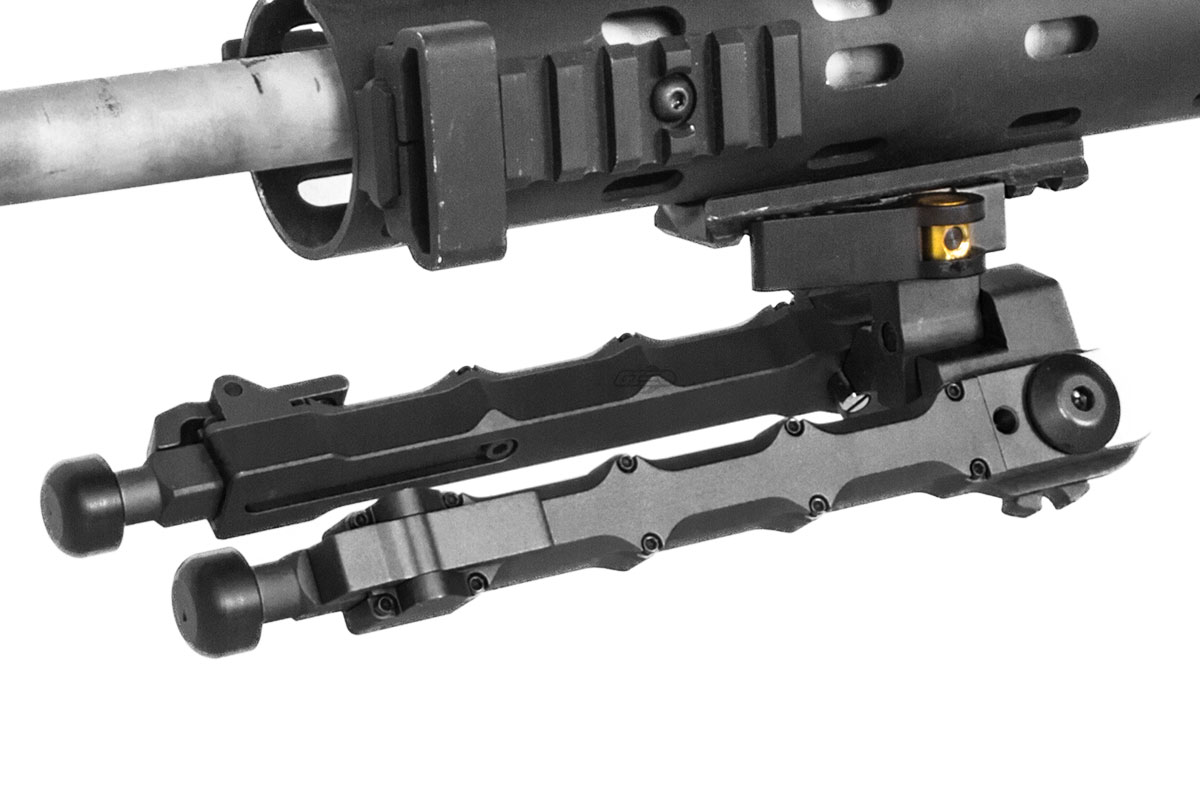 The Blackcat Airsoft BR-2 Style Bipod with the quick detach was designed, engineered, and manufactured in the USA. The BR-2 is constructed from aluminum providing a lightweight bipod, but not sacrificing durablity.