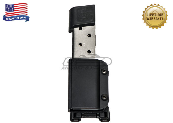 The Revolution Series Magazine Pouches are injection molded out of proprietary super tough polymers making them highly impact resistant and stable in extreme temperatures (from over 300 degrees Fahrenheit to 30 below zero). Each magazine pouch comes equipped with a tek-lok that can be adjusted to fit belts from 1.25" to 2.25" and can be attached without removing or loosening your belt. Adjustable tension screws allow the user to set the retention to their preference.