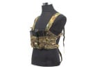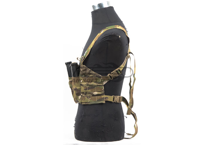 [W09B13C][12183 / TSP-CHESTRIG-SR25-MC]The Blue Force Gear Ten-Speed SR25/ 7.62 Chest Rig is one of the most advanced chest rig systems available on today's market. It features an ultra low platform design that goes completely flat when the magazines are removed, to ensure that it does not get snagged on anything around the user, which can often be the deciding factor between life and death. This particular rig is designed to hold three SR25/ 7.62 or similar sized magazines platforms. There are three MOLLE sections on the left and right side, which are great for adding additional accessory pouches you might need in combat. Near the center of the rig behind the SR25/ 7.62 pouches is a separate pouch for maps and other loose accessories. The Cordura straps allow the user to utilize a lower profile setup for multiple situations. This chest rig comes in a multicam finish, great for blending in with a multitude of different environments across the world.