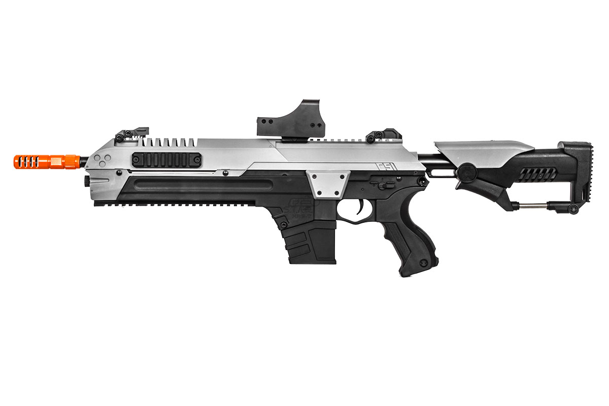 Step into the future of combat with the CSI S.T.A.R XR5 Advanced Main Battle Rifle M4 Carbine AEG Airsoft Gun. The unique polymer external design of the CSI S.T.A.R XR5 is definitely a progress into another era of weaponry. Additionally, the airsoft gun comes fully equipped with rail sections on the top, side and bottom for tactical accessories like a grip and optic. The adjustable stock and ergonomic grip is sure to be comfortable on those long games out on the field. The included magazine is a new design for the Advanced Main Battle Rifle model. However, standard AEG M4 / M16 magazines are also compatible with the airsoft gun. Internally, the airsoft gun has full metal version 2 parts to easily swap to upgrades that are not proprietary. Set yourself ahead of the competition with the CSI S.T.A.R XR5 Advanced Main Battle Rifle M4 Carbine AEG Airsoft Gun!