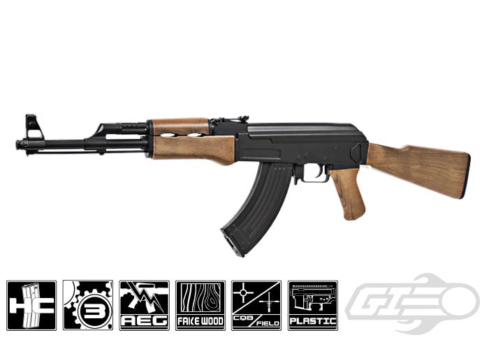 The CYMA AK-47 Airsoft Rifle is an ideal starter gun for beginning players or backyard players given the low cost and lightweight form factor of the gun. The overall construction of this rifle is made of a basic polymer, and is designed to withstand light to normal game play. With a low velocity output, low weight, and overall good build quality, this airsoft gun from CYMA is most ideal for beginner or younger players to get into the basics of airsoft. Included in the box is the gun, magazine, battery, charger, eye protection, and sling to get you going and pew pewing away!