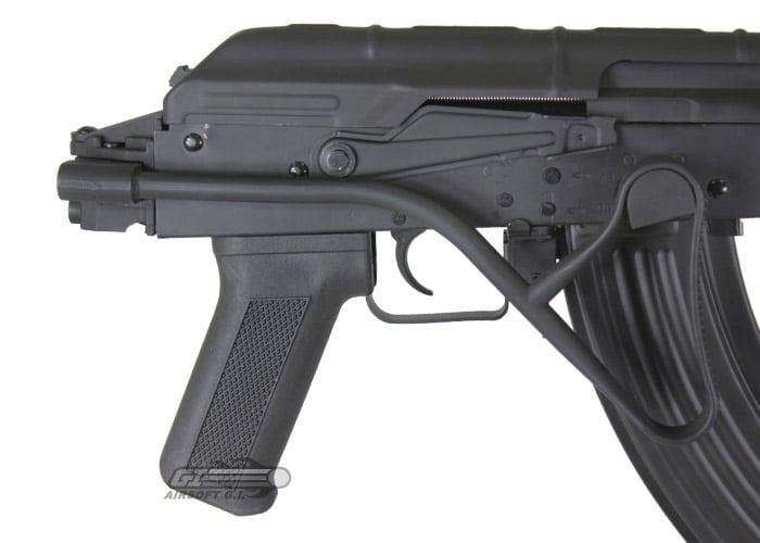 The CM050 is an excellent airsoft reproduction of the AK-47 manufactured by Cyma. Cyma has many standard features on their guns that would be considered upgrades from other companies. For example the receiver, receiver cover, and barrel assembly are full metal. The hand guard is real wood, has an integrated vertical grip, and has a very nice finish to it. For added authenticity the CM050 blows back. Like many other AKs the CM050 includes a 600 round high capacity magazine. The hi-cap magazine and the ability to take a very long stick battery in the receiver will give you an incredible advantage in any skirmish.