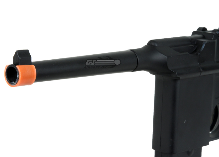 The CYMA Mauser CM712 Spring Pistol is constructed from plastic that keeps the weight down but is not as durable as its high end metal counter part. The CYMA Mauser CM712 is operated by racking the slide which cocks the spring for a single shot. The spring system used in this gun allows it to be very affordable, however it is not skirmishable or realistic. The CYMA Mauser CM712 has realistic features such as realistic sights, slide cocking serrations, textured grip and magazine release. Despite the realistic features, the CYMA Mauser CM712 leaves much to be desired in the authenticity department.