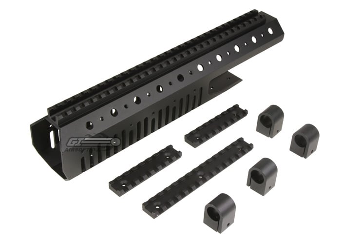 The Cyma Modular M14 RIS is the ultimate Rail Interface System for the M14. Other RAS Kits only replace the heat shield to provide top and side rails. This, however, offers rails on both axis of the gun, and also adds killer looks to go along with its killer potential.