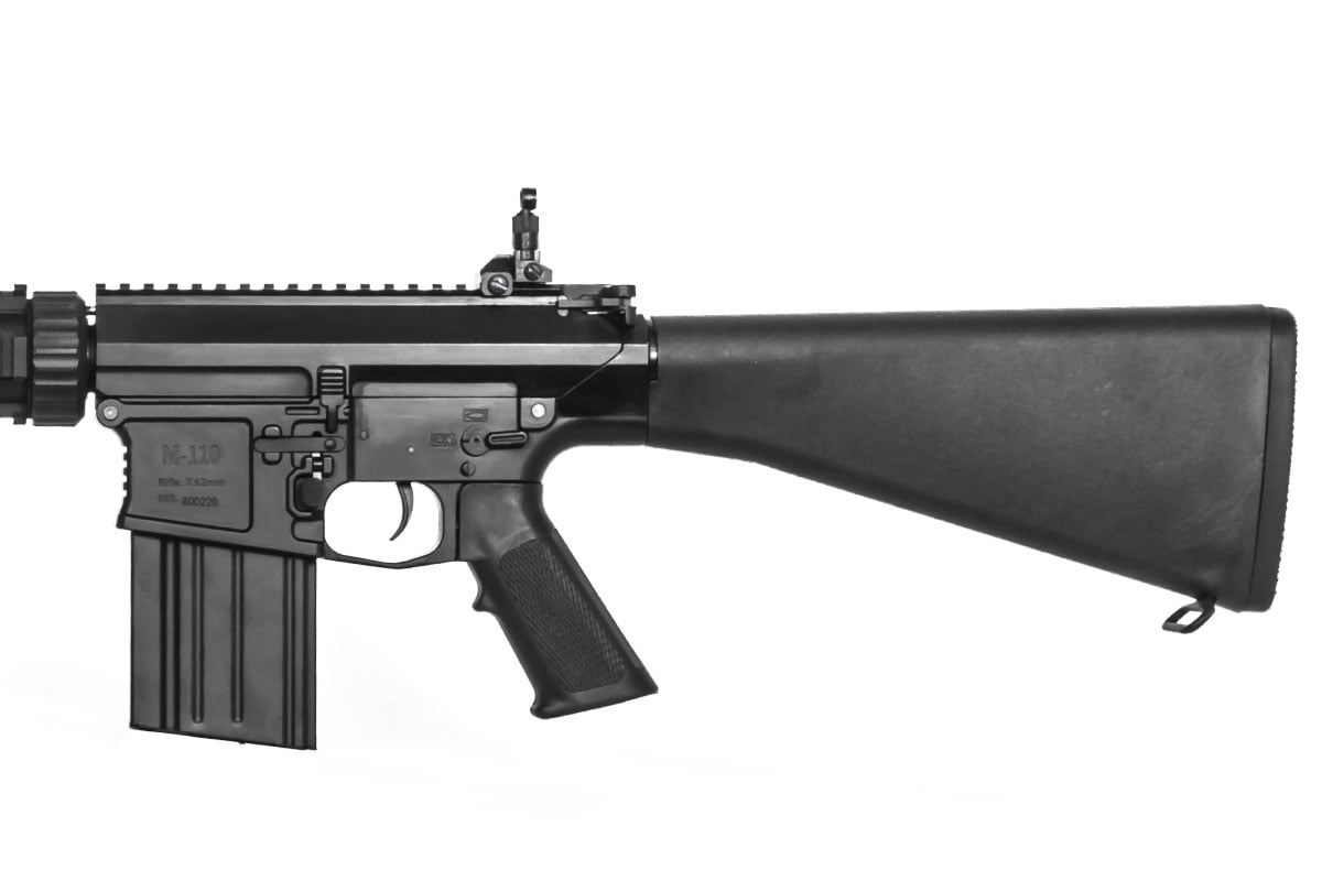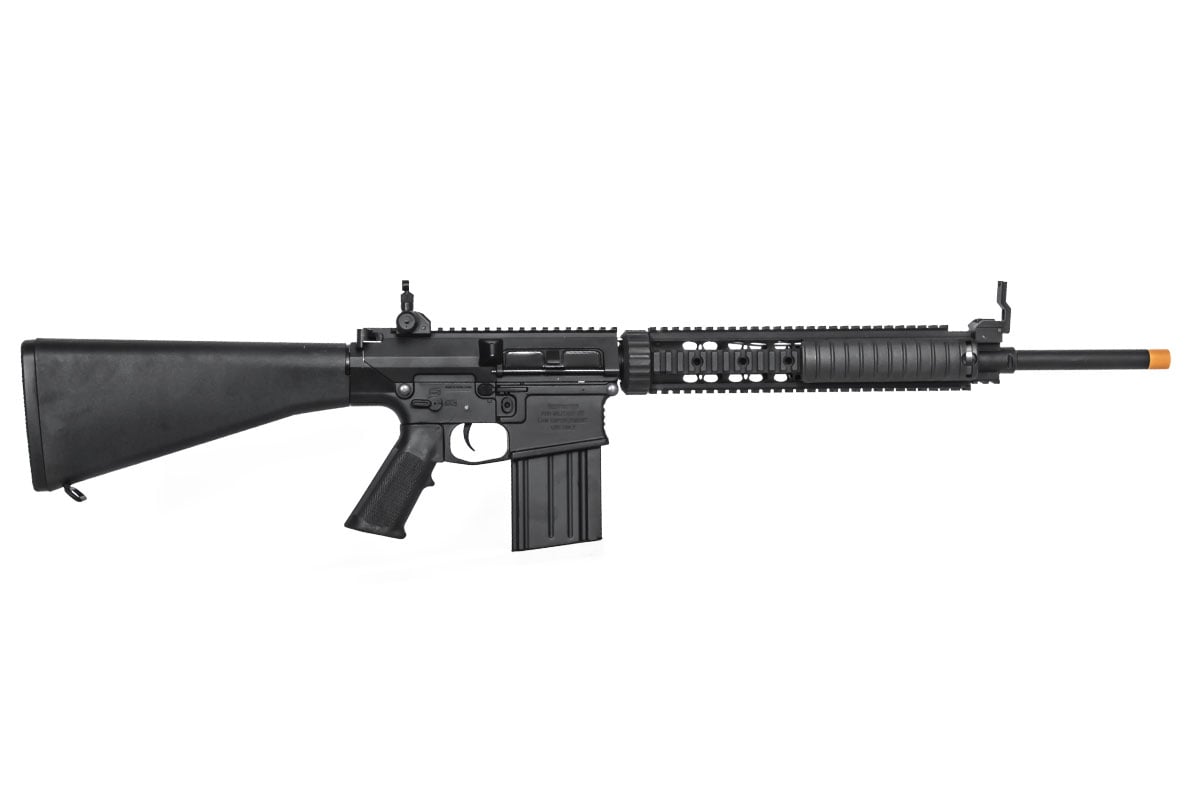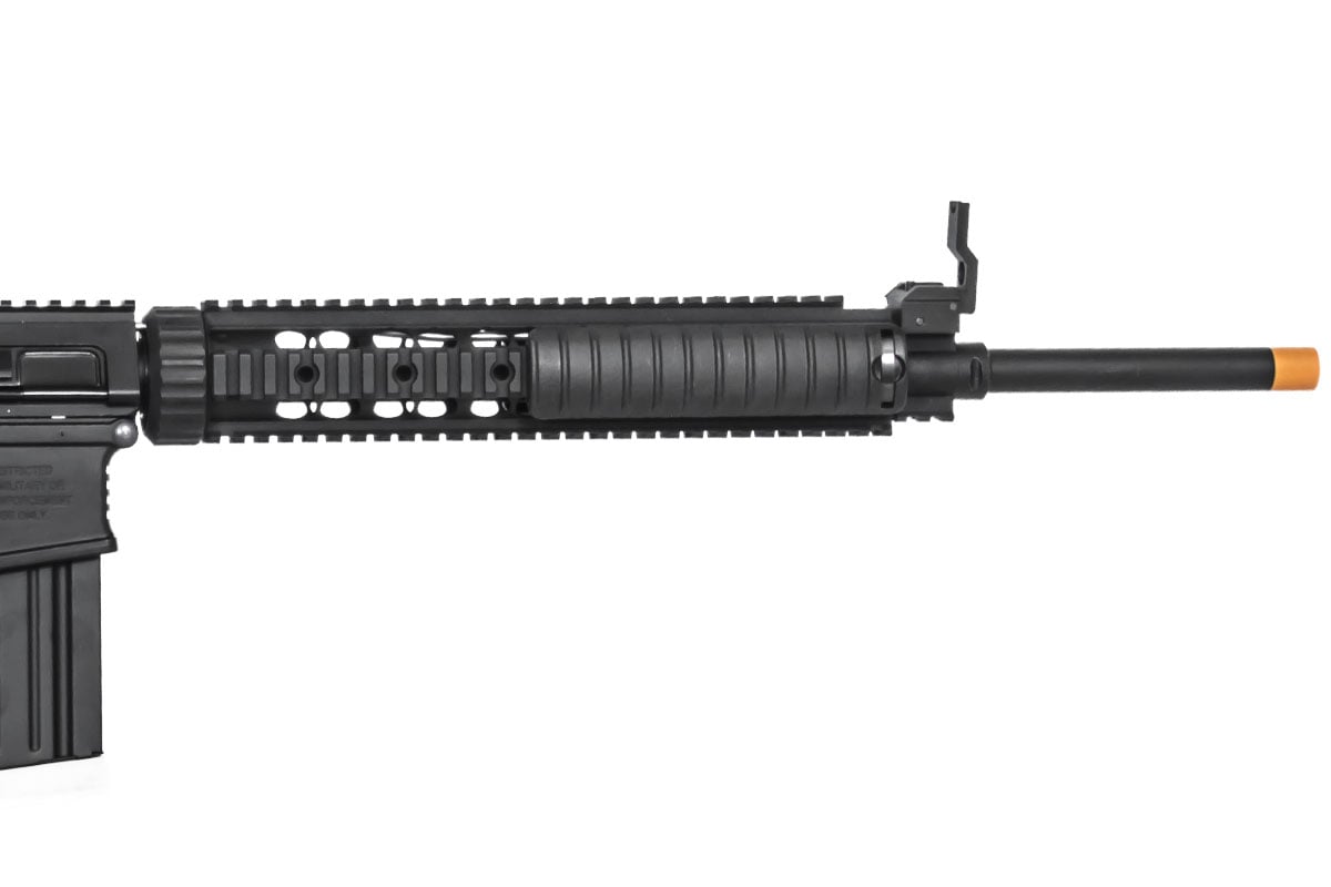 The CA SR-25 comes stock with a metal SR-25 receiver that is bulkier and wider than the standard M4/M16 bodies and allows for greater magazine capacity. The full stock accommodates a large battery to support power upgrades. It also comes with flip up front and rear sights. The rear sight is adjustable for both windage and elevation. The full metal RIS allows for easy installation of all the accessories you need in the field such as lasers, flashlights, and bipods. Also, the gun comes with 2 rail cover panels that ensure a comfortable hold of the airsoft gun.