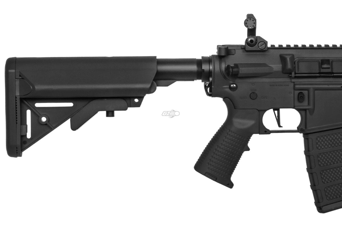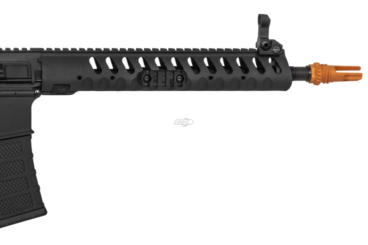 Internally, the gun has a 9mm bushing gearbox, a brand-new electronic control system, inline mosfet protected trigger contacts, 6.03mm tightbore barrel, and a quicker change spring system. Program the electronic control system to shoot at 3 to 5 round burst. Additionally, the ECS has motor protection and low battery detection to help protect the airsoft gun in the long run. It will shoot 330-350 fps using 0.20g BBs and 900-1000 rpm using a 9.6V battery. This model comes with a three prong flash hider that has threads on it to attach a QD mock suppressor. Additionally, there is a flat trigger preinstalled that allows for a quicker trigger pull and response from the airsoft gun.Specifications: