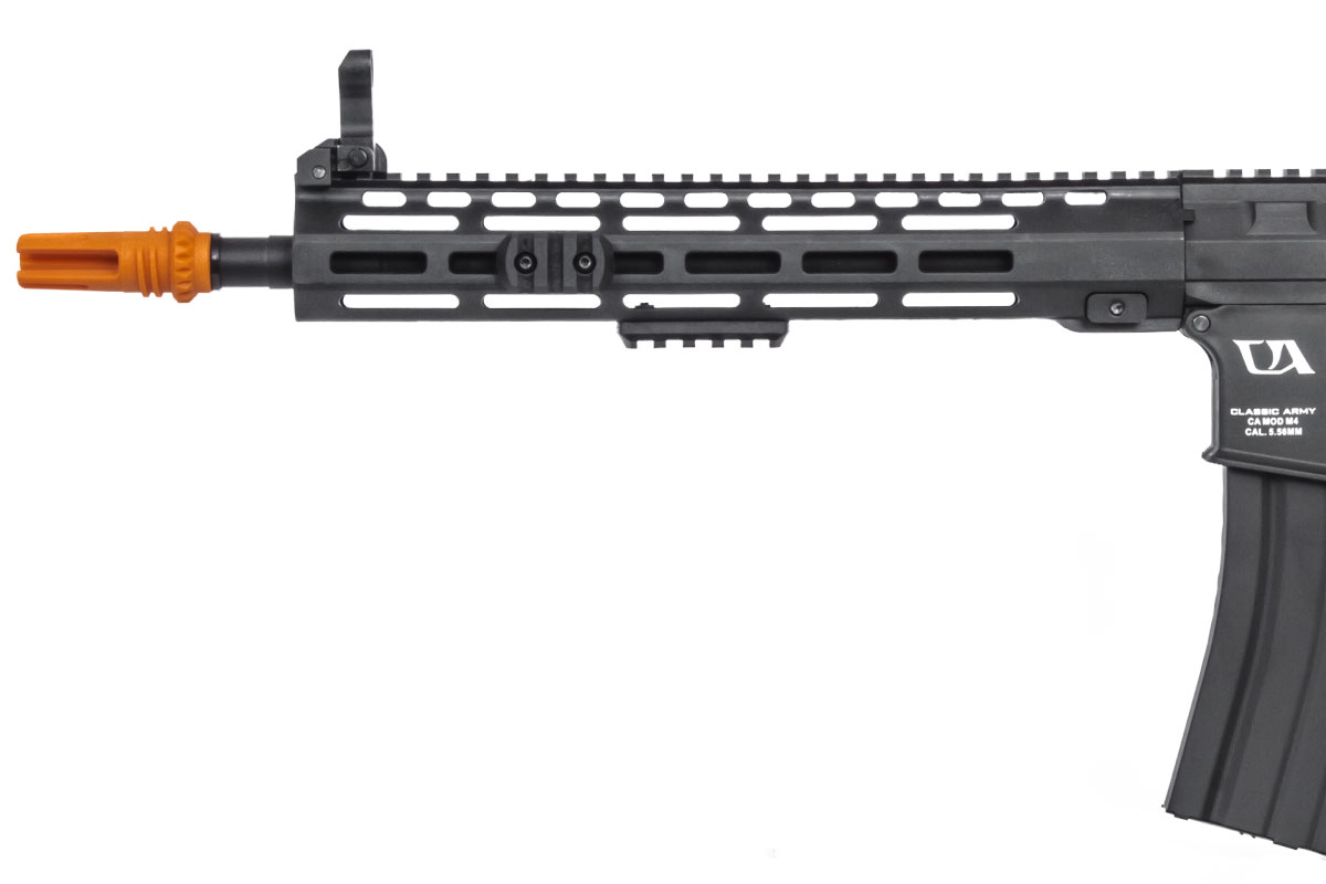 The Classic Army CA4 ML12 M-LOK Skirmish Carbine is one of many Classic Army entry level rifles. Utilizing Classic Army's nylon fiber reinforced polymer allows for a lighter weight platform while ensuring extreme durability in a cost efficient package. The CA4 ML12 features a high rate of fire along, and paired with a 300rd high capacity magazine, allowing devastating firepower to your enemies, leaving them cowering away in cover. It also features an M-LOK rail system for a skeletonized version of a standard RIS M4 rail. Rail segments can be attached to the rail, allowing for the attachments of accessories such as lights, lasers, bipods, or grips. Front and rear sights are included, and can be flipped down, leaving you with plenty of rail space for you to mount an optic. It has a quicker change spring system so that you can quickly and easily upgrade or downgrade your spring once you remove the gearbox from the receiver. Internally, the gun has a 9mm bushing gearbox, 23k motor, a brand-new electronic control system, inline mosfet protected trigger contacts, 6.03mm tightbore barrel, flat trigger, and a quicker change spring system. Program the electronic control system to shoot at 3 to 5 round burst. Additionally, the ECS has motor protection and low battery detection to help protect the airsoft gun in the long run. It will shoot 330-350 fps using 0.20g BBs and 900-1000 rpm using a 9.6V battery. This model comes with a three prong flash hider that has threads on it to attach a QD mock suppressor. Additionally, there is a flat trigger preinstalled that allows for a quicker trigger pull and response from the airsoft gun.Specifications: