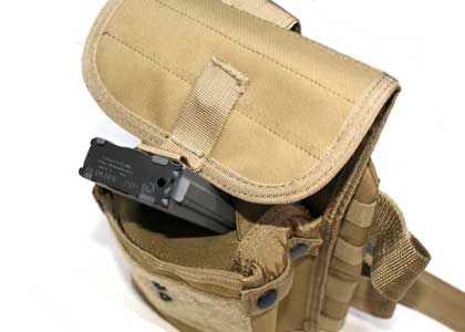 This is a MOLLE ammo dump pouch. It is design for you to dump the spent magazine into this pouch without worry about dropping it to the ground. You can mount it on any type of MOLLE or PAL system thigh rig or vest. Velcro inside the flap keeps the top open for easy access. Elastic "lips" sewn into the opening of the bag help prevent items from coming out