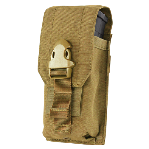 The Condor Outdoor Universal Rifle Magazine Pouch is designed to hold most rifle magazines, be it M4 "Stanag" magazines, G36 magazines with the protruding connectors, the banana shaped AK magazines, or even the very wide HK417 magazines and everything in between. The magazine pouch utilizes a cover flap that is closed and secured by a buckle and a strip of Velcro. This pouch is an excellent and efficient way of carrying additional magazines for any rifle in any collection.