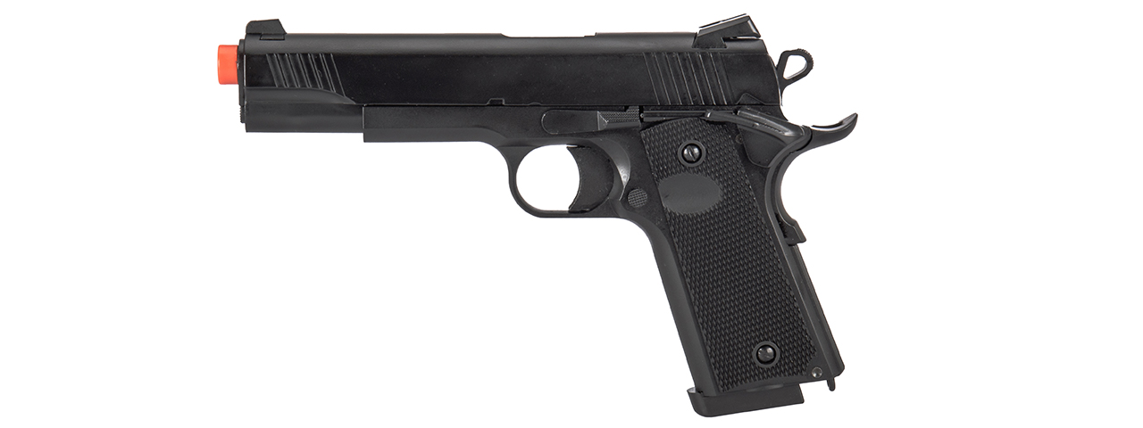 Double bell has come out with their 1911 series striking the market with incredible value and performance. This 1911 model is powered by green gas that allows this pistol to shoot within CQB limits. The black pistol grips add a nice touch in changing the overall tone of the airsoft gun. A slick frame makes holstering the gun easy, with less opportunity for snags. The metal construction feels great in the hands with its rigid and lightweight build. The front and rear serrations makes the slide a breeze to pull when reloading for your next first shot. Adjust the hop up with ease assuring you have your aim on point where ever your go. The blowback action is extremely satisfying with every shot providing a crisp and hard slide movement. This pistol is truly a remarkable airsoft gun that you can take into the field with you whether is be for CQB or field operations.