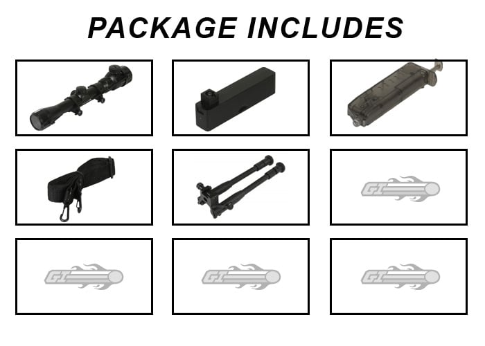 Package Includes: Gun, Magazine, Speed Loader, Bipod, Scope and Manual