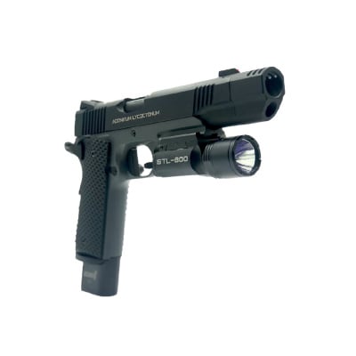 The Echo 1 Wolfsbane series is one of the most combat ready 1911s available in the airsoft market. Out of the box, this airsoft pistol includes a 30 round magazine for plenty of fire power to annihilate your targets. The aggressive pistol panels are textured allows for a positive grip. The cut channel on the left panel allows for easy access to the extended magazine release. The ambidextrous safety selector make this gun left hand friendly. The front fiber optic allows for quick target acquisition and the rail mount can attach a variety of flashlights and lasers. With the threaded barrel adapter you can add a mock suppressor, amplifier, or tracer unit. Or you can install the included compensator and make this gun look bad ass! Included in this Echo 1 package is the Bravo STL800 LED weapon light.