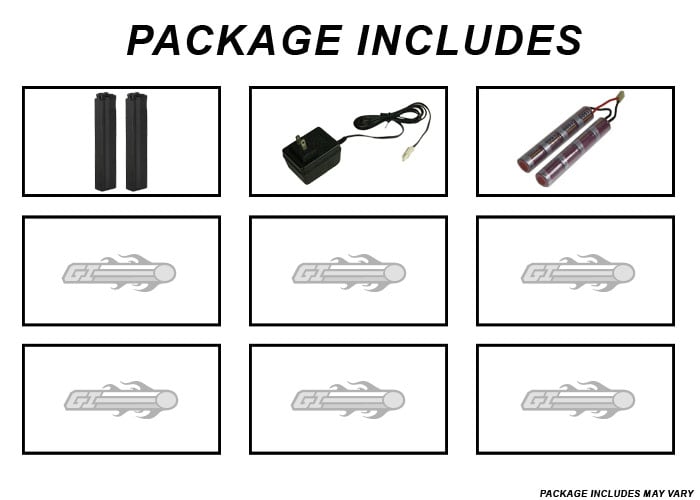 Package Includes: One (1) Gun, Two (2) Magazines, One (1) Battery, One (1) Charger