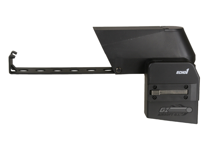 Echo 1 Box Magazine for Marui/CA/Echo 1 E90. This high capacity box magazine for the E90 utilizes the feeding mechanism of a hi-capacity M16 magazine - either the 190 round VN type magazine or the 300 round M16 / M4 type magazine. This box magazine has a roll-away cover on top that allows you to pour BBs in quickly and easily. By replacing the standard magazine, there is now room for installation of a large battery. ABS plastic construction with metal spine. A must for serious users of the E90.