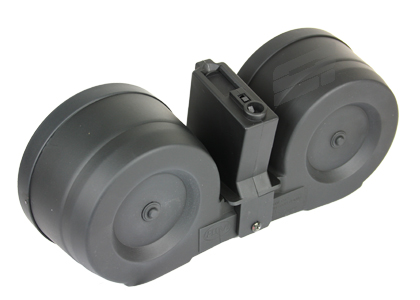 The Echo 1 Drum Magazine For M16 Series (Electric motor Power) is powered by four AAA batteries and holds up to 2500 rounds. It loads through the hatch on the top of the magazine like any high capacity magazine. The magazine is wound by a pressure switch that plugs into the rear of the magazine like headphones into a CD player.