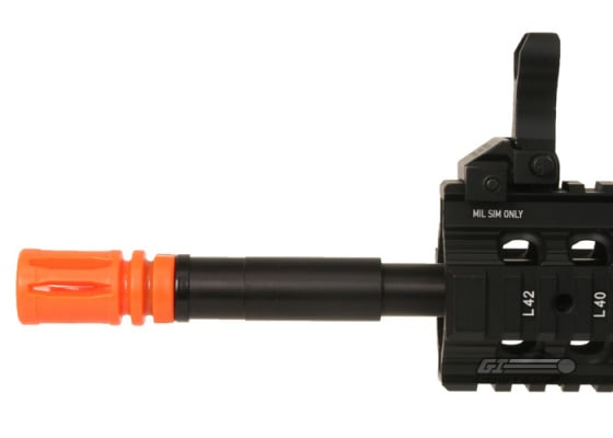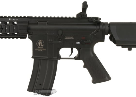 The Echo 1 TROY MRF-X Airsoft Gun is an awe inspiring new addition to Echo 1's line-up of great performing airsoft gun options. The body of the gun is constructed of their high impact ABS plastic, which cuts down significantly on both the overall cost and overall weight of the gun, and it boasts fully licensed Troy Industries trademarks paired on the left side with the widely recognized Trojan Horse Logo. The RIS unit is a 10" free float design that mates perfectly with the upper receiver to create a continuous top rail and an overall smooth, flush look. This top rail comes equipped with flip-up front and rear Troy Industries Battle Sights, and provides more than enough rail space for the addition of optics, PEQ boxes, lasers, or other accessories. The Mid-Length design makes this airsoft gun perfect for field or MOUT operations, and the six position adjustable crane stock allows the overall length of the gun to be adjusted to fit just about any player. Overall, the Echo 1 TROY MRF-X Airsoft Gun is both aesthetically pleasing, and great performing, so it will definitely make a great addition to any player's arsenal.