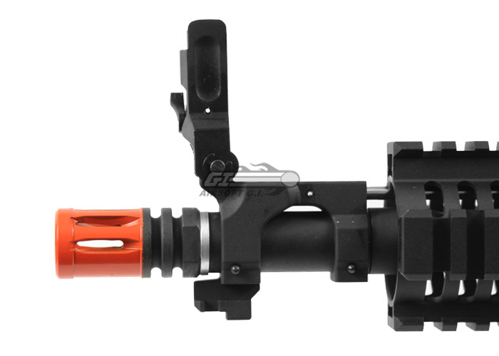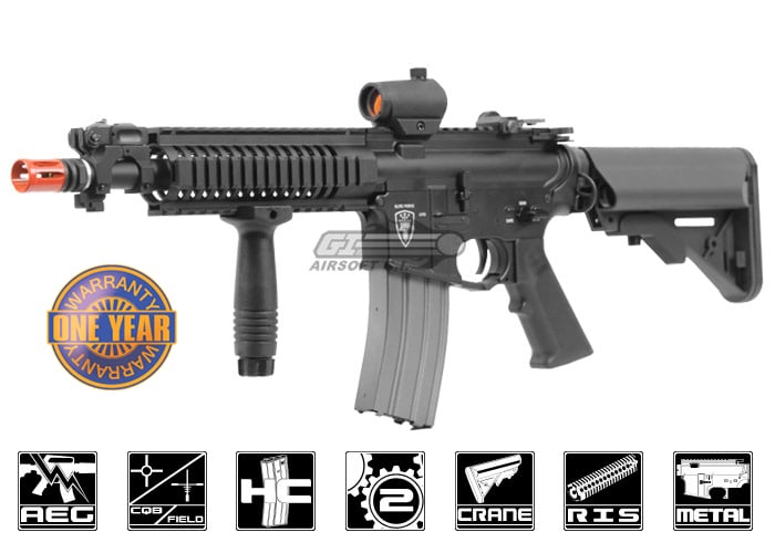 The Elite Force Full Metal 4CRS AEG Airsoft Gun is an absolute work of art. The body of the 4CRS is constructed entirely out of metal, giving it a very realistic look and feel, and it boasts impressive looking Elite Force trademarks that are very aesthetically pleasing. The 7 inch free float rail system mounts flush with the front of the receiver, giving it a very clean, and still very aggressive look overall. The gun also features flip-up front and rear iron sights, with the rear being removable, as well as a functioning charging handle and bolt catch, which add an extra element of realism to the game when using this gun. Being that the 4CRS is OEM manufactured by VFC, the internals of the gun are sure to stand up to any abuse that you could put them through during combat, and to top it all off, the Elite Force Full Metal 4CRS AEG Airsoft Gun features a full 1 year manufacturer warranty, which is something that has never been offered by any other airsoft manufacturer.