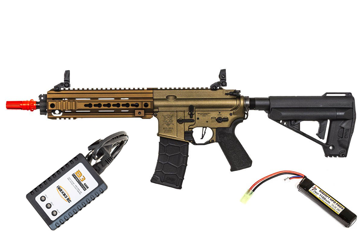 An Experienced Player's POVThe Calibur CQB, like the Calibur Carbine, is the twin to the Saber CQB. Like the larger Carbine, it uses a 416-style rail and upper receiver. The Calibur is slightly beefier than its twin due to the upper receiver assembly, but it is still very good for CQB applications with an FPS of 380 very consistently when you're using 0.20g BBs. The Avalon series by VFC is without a doubt the best out-of-the-box rifle on the market. For the Avalon series, VFC created the ECS gearbox, which is the bone structure of the Avalon AEGs. Starting with the gearbox shell, VFC smoothed out the machining and reinforced high-stress areas of the shell. The self-shimming gears have been done away with and replaced by stronger and slightly faster gears. The tappet plate, piston and spring guide have all been upgraded for further durability than in older VFC replicas. Lastly, the motor has been significantly upgraded from what VFC has used before. Using high-power magnets, the motor is high torque but also very zippy. This power combined with the full metal gears and a newly included basic MOSFET give the Avalon series amazing trigger response out of the box. This gearbox is recommended to be used with a 7.4v LiPo battery. On an 11.1v battery. The motor has a lot of power and will start to produce a very consistent 2-round burst while on semi-auto fire. This can be remedied by doing small modifications to internal components. But the Avalon VR16 CQB is more than just an internal workhorse. It has the external features to take down the competition as well. Their QRS adjustable stock and trigger guard allows you to get around almost any indoor or outdoor area with ease. VFC has also added an ergonomic motor grip to help your hands stay steady. Airsoft GI has the Avalon Calibur in black or bronze colors. You can save by upgrading to a battery and charger combo pack.