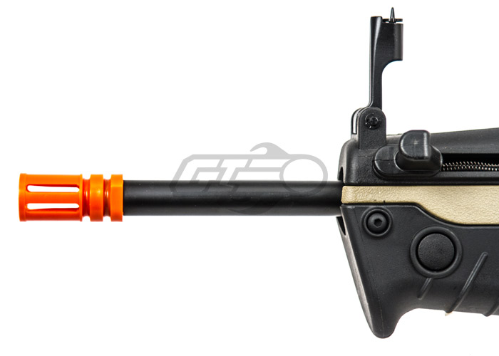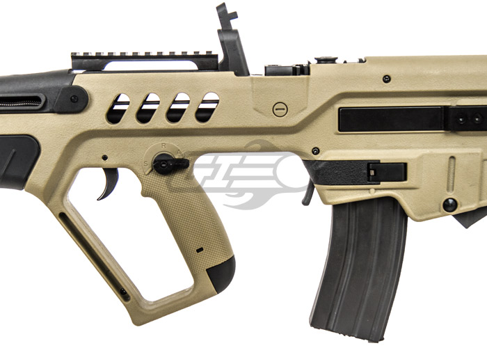 The Elite Force IWI (Israeli Weapon Industries) Tavor Tar 21 is one of the most innovative guns in the small arms industry; this airsoft gun is based on the rifle the IDF chose to replace the M16. Externally, the Elite Force TAR-21 outer body is constructed from a high strength nylon polymer, which keeps both the gun's overall weight down, as well as taking advantage of a bullpup design, which reduces the overall length of the rifle, because of this, the rifle can use a rifle length inner barrel and maintain a shorter profile. These factors, along with the good hop up and muzzle velocity being around 380FPS make for a great field gun. The gearbox is version 6 layout, and is constructed entirely out of metal, a long with all of the vital parts on the inside, with the polymer internal parts being most of the compression parts, this gives the gearbox good longevity and easily replaceable parts when necessary. Unique to the rifle is the functioning bolt catch that also de-tensions the spring which keeps the spring from losing strength, and reduces stress on the gearbox, as well as an electronic blowback when firing.