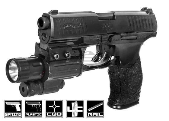 The Umarex Walther PPQ Spring Powered Pistol Airsoft Gun is constructed primarily from plastic that keeps the weight down but is not as durable as its high end metal counter part. The Umarex Walther PPQ Spring Powered Pistol Airsoft Gun is operated by racking the slide which cocks the spring for a single shot. The spring system used in this gun allows it to be very affordable, however it is not skirmishable or realistic. The Umarex Walther PPQ Spring Powered Pistol Airsoft Gun has realistic features such as realistic sights, slide cocking serrations, textured grip and magazine release. Despite the realistic features, the Umarex Walther PPQ Spring Powered Pistol Airsoft Gun leaves much to be desired in the authenticity department.