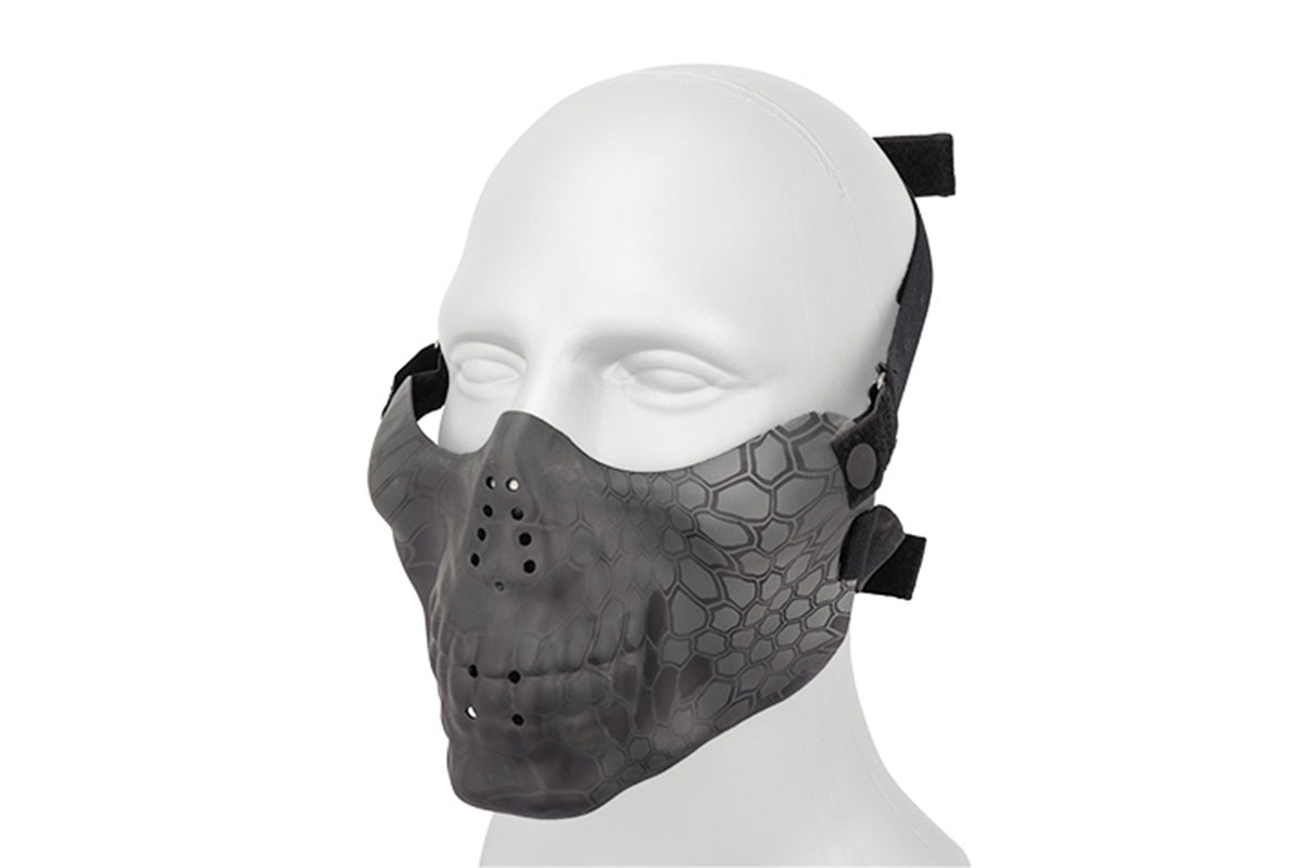 [30902 / AC-587TY]The Emerson Half Face Skull Mask is designed to protect the users lower portion of their face and part of their nose. This mask is constructed out of a polymer to qualify for certain lower face protection at most airsoft fields. The half mask can be secured and adjusted with the elastic straps on the rear of the mask. This is a low profile and simple way to protect you face in conjunction with proper eye protection, the overall result is a lightweight setup.