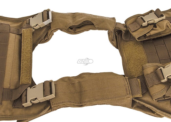[T05C02][21857 / AC-464T]The Emerson Scalable Plate Carrier has many useful features for use in an airsoft kit. The plate bags accept 10x12 medium sized SAPI style plates. The front and rear plate bag faces have plenty of MOLLE webbing for any MOLLE compatible pouches. The shoulder and internal waist straps are adjustable for most sizes. The front plate bag features a section of Velcro for the placement of patches or name tapes. Included with the plate carrier comes with a triple M4 magazine pouch, two grenade pouches and foam plate inserts.