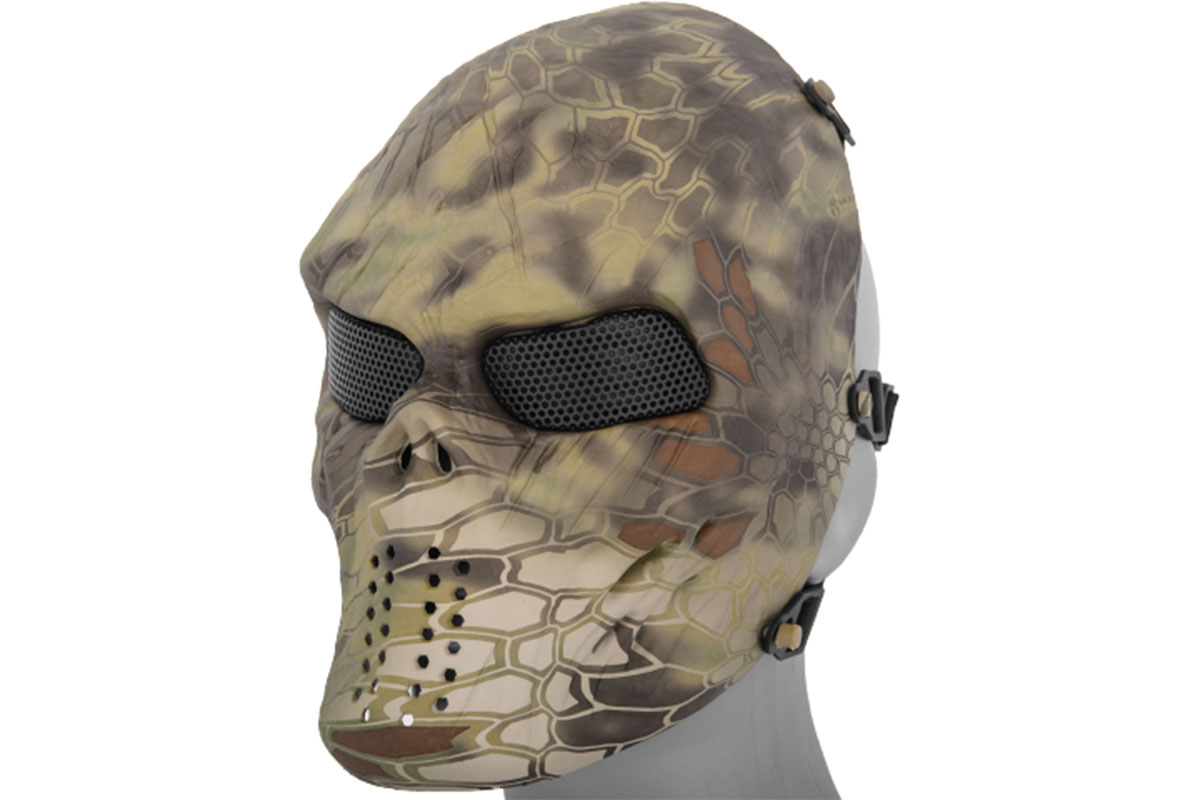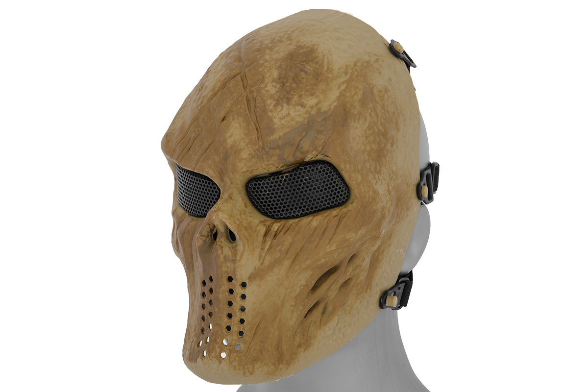 The Villain Skull Mesh Face Mask is a great option for full face protection. The mask secures tightly with the assistance of the adjustable straps on the rear of the mask. Please keep in mind, a mesh lens will stop large solid objects such as a BB but cannot stop smaller objects like sand, dust, smoke or fragmented BBs.