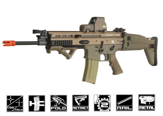 VFC has taken their popular MK16, which has been referred to as the best replica of the MK16 currently on the market, and made it even better. The VFC Full Metal FN Herstal SCAR-L MK16 STD Airsoft Gun is now fully licensed by FN Herstal of Belgium, and is arguably the most realistic SCAR-H replica on the airsoft market. The VFC SCAR-L maintains many of the same features and controls as the M4/M16 series, so the transition for users is simple. In addition, the MK16 has many improvements over the M4 and the M16. The lower receiver is constructed from sturdy polymers to reduce weight. The magazine release and selector switch are ambidextrous, and the bolt release is functional. Not only is the stock retractable it is side folding and has an adjustable cheek rest, and unlike the many other brands, the wires are not exposed when the stock is folded.As if all of that wasn't enough, An integrated and uninterrupted rail runs along the top of the receiver giving the user plenty of room to mount optics and night vision equipment. In addition, there is a rail on the underside of the handguard and two removable rails for each side of the handguard that enable the user to mount accessories like a flashlight or vertical grip. VFC has really outdone themselves on this one.