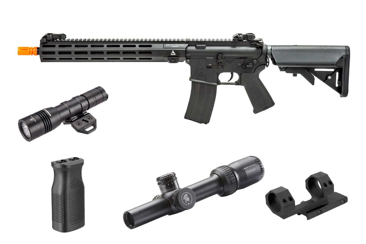 Package Includes: Gun, Magazine, flashlight, vertical grip, scope mount, optic