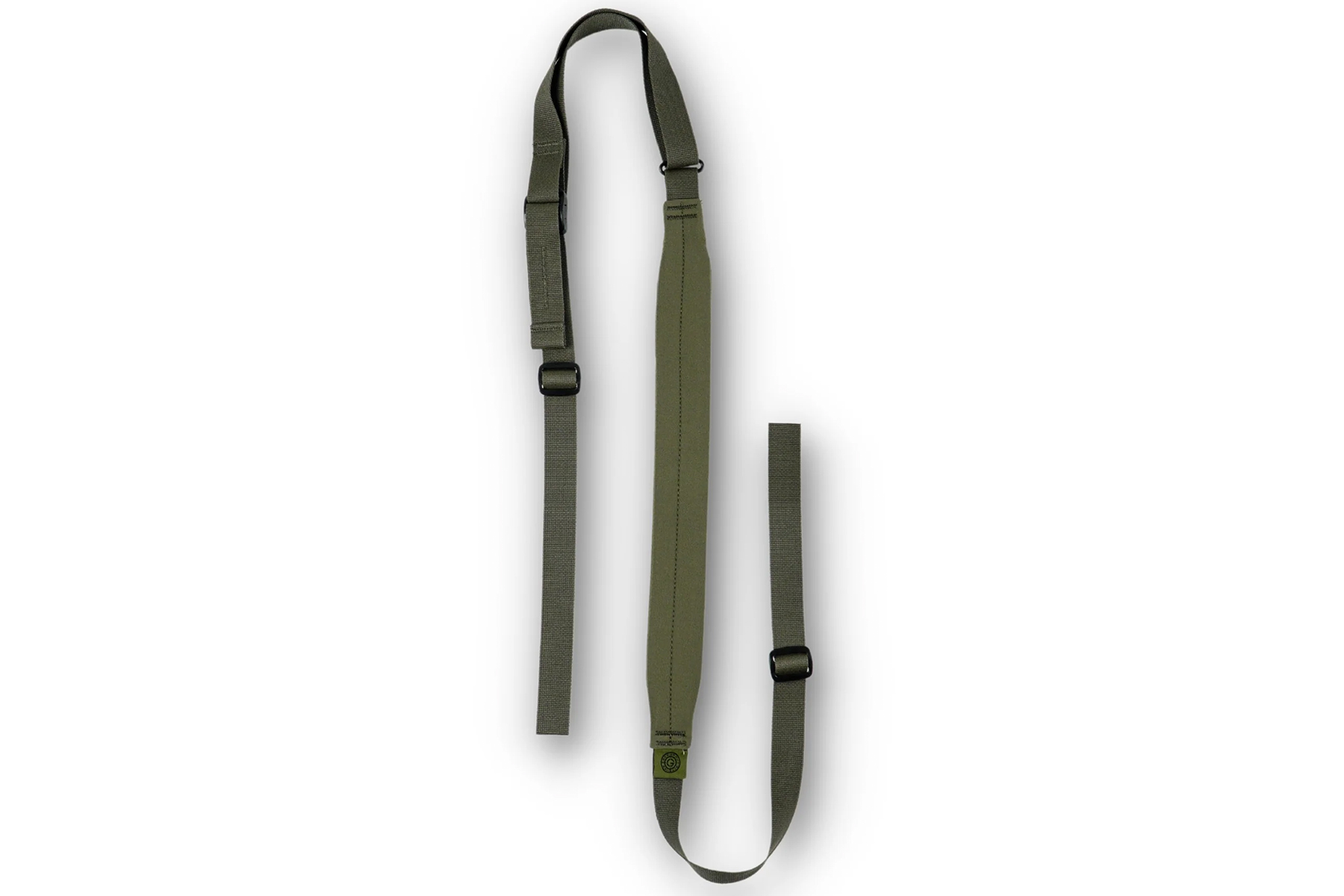 A 16-inch minimalist neck pad uses closed-cell crosslink padding and a four-way stretch Tweave cover to glide without friction and prevent neckwear during long use. The sling’s forward lead (40") and rear tail (20") are both adjustable — the forward lead is trim-to-fit and the rear uses a single tri-glide for quick fine-tuning. A reinforced 4" pull tab with double center bar tacks allows fast on-the-move adjustments and can convert to a thumb loop if preferred.