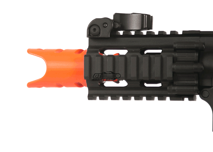 The G&G Fire Hawk is another great addition to G&G's line of high performance airsoft guns. The Fire Hawk is designed to be one well performing airsoft gun for the CQB environment. Externally, the Fire Hawk features a collapsible stock with a small battery compartment for CR123A batteries. Standard pistol has been replaced with the G&G ergonomic grip. Not only is the grip contoured to the shooters hand for more comfort but also better weapon manipulation. The upper and lower receiver are made of a strong polymer being able to withstand different types of impact. The front assembly features a 3in outer barrel and unique amplifier. The 3.5in rail system provides just enough rail space for a vertical grip, flash light, or laser. With the gun being wired to the rear, weight distribution is better as well as providing a clean and simple appearance. Internally, G&G's performance non blowback gearbox plus their new Titian 35000 motor provides more than enough rate of fire output for CQB but as well as the reliability. Overall, this is a well built airsoft gun for CQB, the ergonomics and mobility is by far superb, and the internals are excellent. This is a unique m4 platform the flash hider gives it a very unique but aggressive look.Specifications: