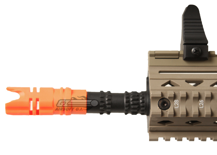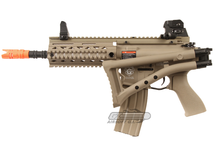 If you are looking for an innovative piece ideal for CQB but aren't looking to spend a lot of money, consider the tan G&G Combat Machine GR4 100Y Folding DST M-4 Carbine Blowback AEG Airsoft Gun from Airsoft GI. The G&G GR4 100Y plastic Blowback AEG airsoft gun is a very interesting addition to G&G's already impressive lineup of M-4 AEGs. It features a polymer body and rail system, keeping it both lightweight and durable, and a folding stock that drastically reduces the overall size of the gun, making it perfect for close quarters engagements.