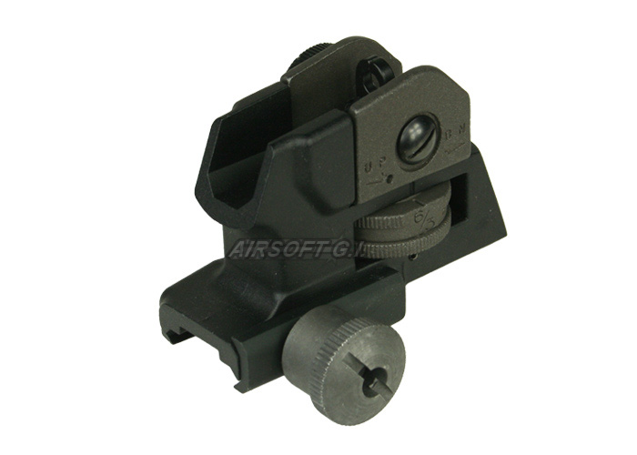 Attaches to various flat top M16 variant upper receivers. Designed for use with standard Weaver rail systems. The G&G Rear sight is made of aluminum and steel, giving it a very durable construction. The height of sight will line up with standard front sights and/or flip front sights.