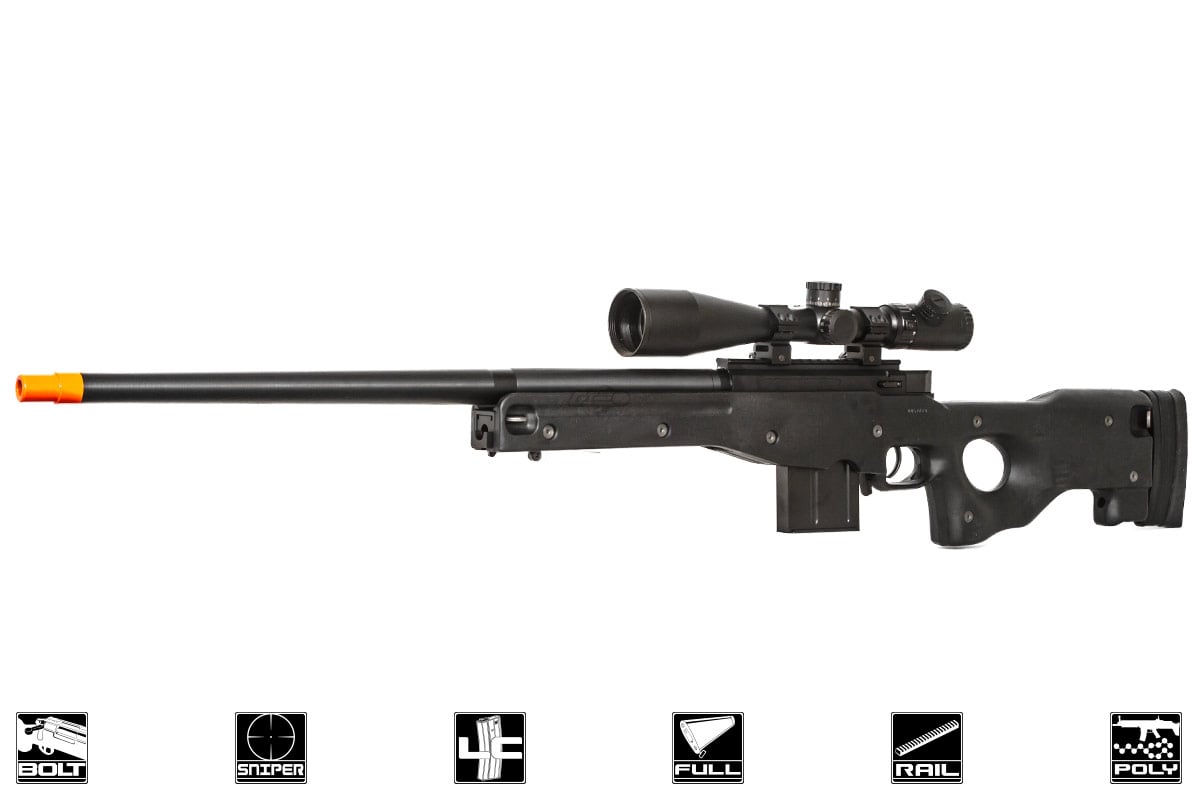 Above the bolt of this airsoft gun is a metal, integrated rail which makes mounting the optic of your choice simple and stress free. The front of the stock features a quick detach perch for a bipod, and there are metal sling attachment loops at the front and rear of the airsoft gun. The removable box magazine is easy to load and reload, making this rifle have a bit of a leg up on it's contemporaries.Specifications: