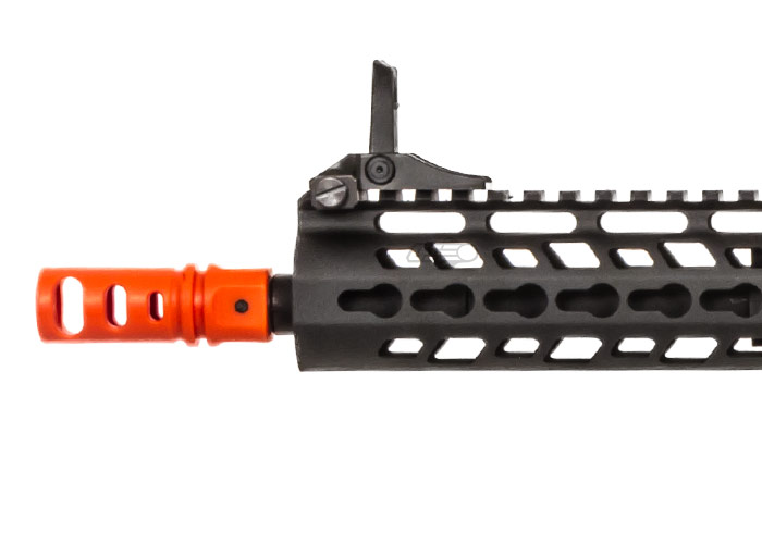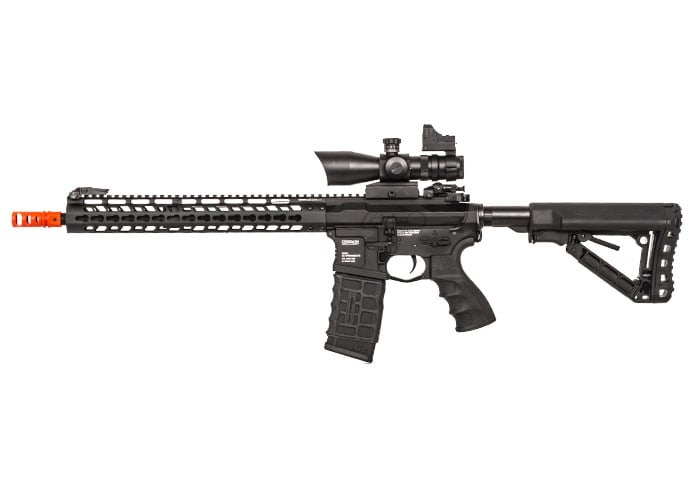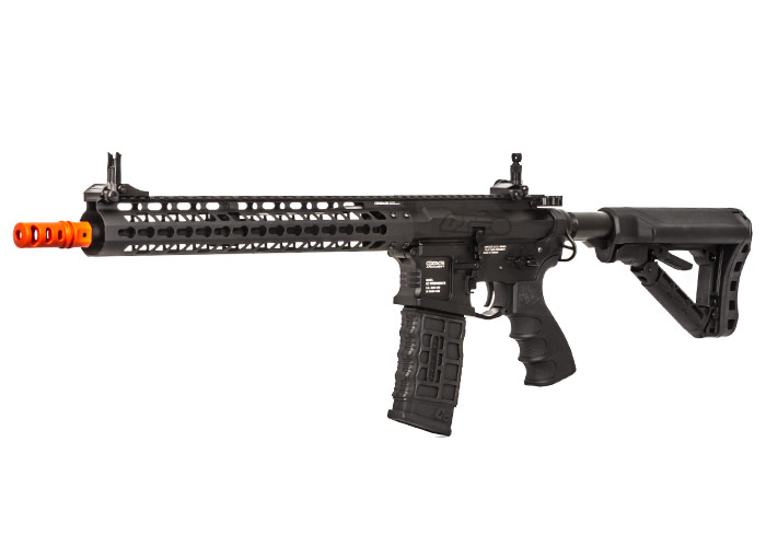 Another great feature of the G&G CM16 Wild Hog M4 Carbine is its left-hand friendly capability with the ambidextrous charging handle, fire selector switch, rear sling mount and magazine release. The ergonomic six-position retractable crane stock holds the battery compartment and has a newly designed rubber pad for extra comfort on shouldering the airsoft gun. Additionally, the Wild Hog features a CNC-machined full-metal KeyMod modular rail system that is known for its lighter weight compared to most rail systems. At 13.5 inches, the accessory rail holds a plethora of lights, optics and other gear. The GC16 has an installed pre-programmed MOSFET chip that is able to stop batteries such as a LiPo from over-discharging and becoming damaged. The MOSFET is programmable to shoot from full auto to three-round bursts using the electronic trigger unit. This feature also increases response and assists in preventing trigger burns or locks in rapid semi-auto firing. The nylon fiber ergonomic pistol grip, which also houses the motor, will give you a strong hold when you're getting wild on the field. Aggressive styling such as the recessed amplifier gives it the right appearance and sound. Look no further for a high-quality airsoft gun that fits your needs.Specifications:
