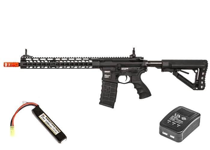 Another great feature of the G&G CM16 Wild Hog M4 Carbine is its left-hand friendly capability with the ambidextrous charging handle, fire selector switch, rear sling mount and magazine release. The ergonomic six-position retractable crane stock holds the battery compartment and has a newly designed rubber pad for extra comfort on shouldering the airsoft gun. Additionally, the Wild Hog features a CNC-machined full-metal KeyMod modular rail system that is known for its lighter weight compared to most rail systems. At 13.5 inches, the accessory rail holds a plethora of lights, optics and other gear. The GC16 has an installed pre-programmed MOSFET chip that is able to stop batteries such as a LiPo from over-discharging and becoming damaged. The MOSFET is programmable to shoot from full auto to three-round bursts using the electronic trigger unit. This feature also increases response and assists in preventing trigger burns or locks in rapid semi-auto firing. The nylon fiber ergonomic pistol grip, which also houses the motor, will give you a strong hold when you're getting wild on the field. Aggressive styling such as the recessed amplifier gives it the right appearance and sound. Look no further for a high-quality airsoft gun that fits your needs.Specifications: