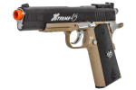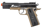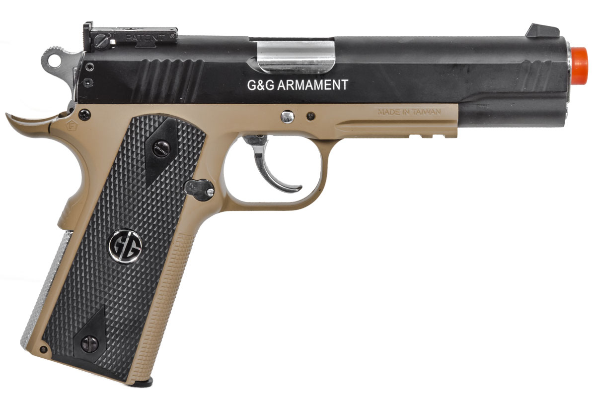 The G&G Full Metal Xtreme 45 CO2 Airsoft Gun is G&Gs first airsoft pistol. This is a very unique and highly effect pistol from G&G, as if you would expect anything else. It's a blowback pistol but the slide does not make a full cycle, it only moves about 1". The slide is restricted from moving all the way back because the firing system is made stationary, and the only reason the slide moves at all is to reset the hammer. Since the gas system, the magazine, and the chamber don't move at all this gun is extremely powerful/accurate/and efficient. In addition to these great performance features G&G has also given the Xtreme45 a railed lower frame to mount lasers and/or flashlights. G&G's first pistol is very impressive, it will be interesting to see what they come up with next.