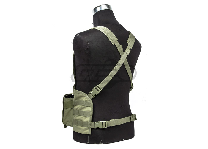 [S01B03][15135 / 90101-001]The Gryffon Golem Chest Rig provides an amazing value for minimum price. The feature set on these chest rigs can all cost, at a minimum, $30 dollars for the entire set when purchased separately, but Gryffon Golem has created a chest rig with integrated magazine pouches, a kangaroo style internal pocket, and even extra molle space for additional pouches for only $14.95! The chest rig features magazine pouches that fit a variety of magazines, such as AR15/M4/M16, SR25, AR10, FAL, M14, AK47, AK74, etc. The magazines are secured via elastic and a Velcro flap. The flap can be adjusted for a close fit or removed. The pouches also have grommets in the bottom for drainage. On each side of the magazine pouches is a 4x3 grid of MOLLE webbing that can be used for the addition of magazine, utility, canteen, medical, and/or radio pouches. The shoulder straps have webbing that can be used to secure various pieces of kit like a tourniquet or radio speaker mic. They also have plastic release buckle on each side for quick donning and doffing. The shoulder straps are low profile so they add no bulk over body armor or under backpack straps. There is also an internal pocket that can be used to carry relatively flat items like a map or data book. Overall, this chest rig is an unbeatable value for the feature set it offers, and is great for those who are starting out, or for those who are looking into a new kit!