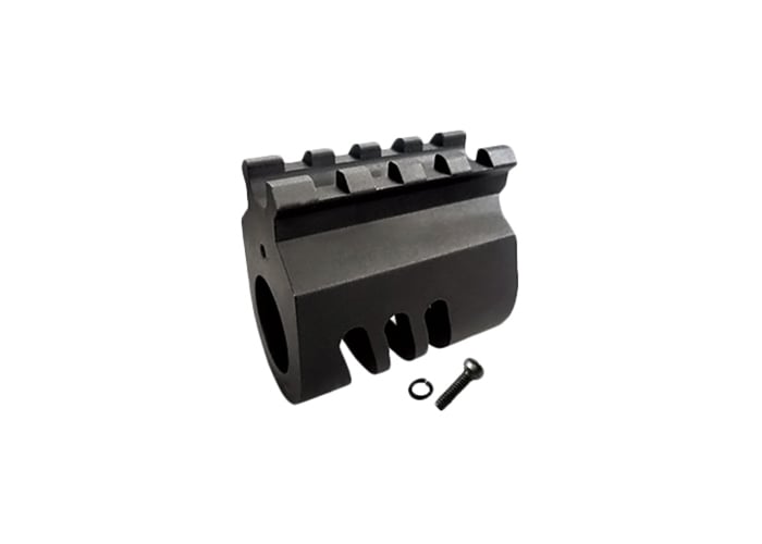 Featured here is the ICS CQB Front Sight Basis. This product will allow a user to mount a picatinny rail on the front barrel, which allows for great flexibility in creating a unique and personalize airsoft gun. The top rail will support any front sight capable of installing onto a 1913 Picatinny rail.