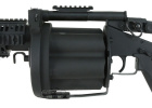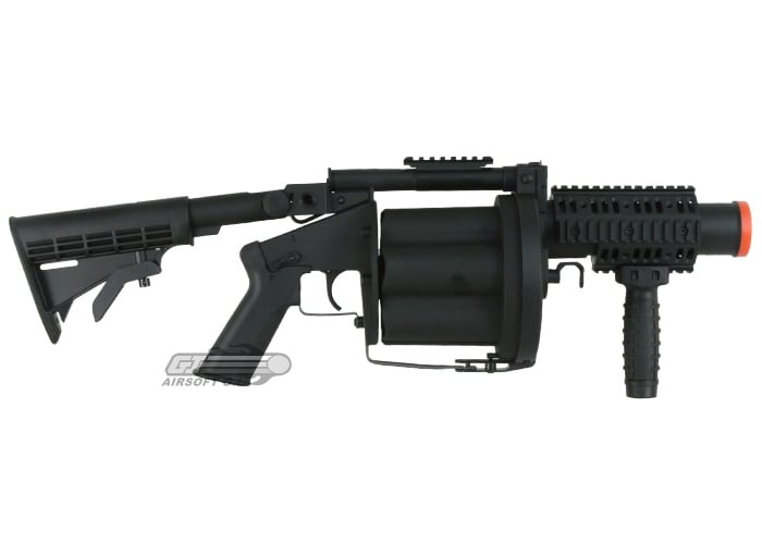 The ICS GLM Full Size Revolving Grenade Launcher is constructed from a high strength polymer and is capable of holding 6 40mm grenade shells. The ICS GLM is constructed out of a high strength polymer to keep weight down while being very durable and shatter resistant. The ICS GLM features a full rail system on the front of the gun which is perfect for a vertical fore grip, light or even a laser, also featured is a top rail for mounting of a red dot optic. A buffer tube with LE stock is mounted at the back of the launcher which is able to be adjusted to 3 different angles and 6 lengths. Two QD sling swivel points are located at the base of the buffer tube as well as a included rail mounted QD sling point on the railed hand guard of the launcher. A latch under the back of the hand guard is used to open the revolving cylinder and allows quick access to reload your 40mm grenade shells. The revolving mechanism of the ICS GLM is operated by rotating the cylinder counter clock wise and tension can be released via a small lever near the front of the cylinder assembly. The ICS GLM is the latest in revolving grenade launchers and definitely stands out from the crowd.