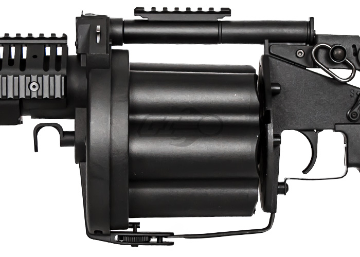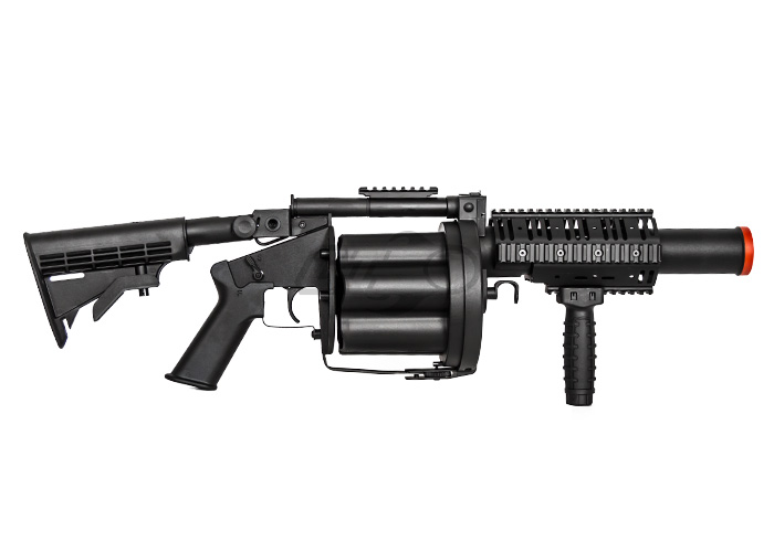 The ICS GLM Full Size Revolving Grenade Launcher is constructed from a high strength polymer and is capable of holding 6 40mm grenade shells. The ICS GLM is constructed out of a high strength polymer to keep weight down while being very durable and shatter resistant. The ICS GLM features a full rail system on the front of the gun which is perfect for a vertical fore grip, light or even a laser, also featured is a top rail for mounting of a red dot optic. A buffer tube with LE stock is mounted at the back of the launcher which is able to be adjusted to 3 different angles and 6 lengths. Two QD sling swivel points are located at the base of the buffer tube as well as a included rail mounted QD sling point on the railed hand guard of the launcher. A latch under the back of the hand guard is used to open the revolving cylinder and allows quick access to reload your 40mm grenade shells. The revolving mechanism of the ICS GLM is operated by rotating the cylinder counter clock wise and tension can be released via a small lever near the front of the cylinder assembly. The ICS GLM is the latest in revolving grenade launchers and definitely stands out from the crowd.