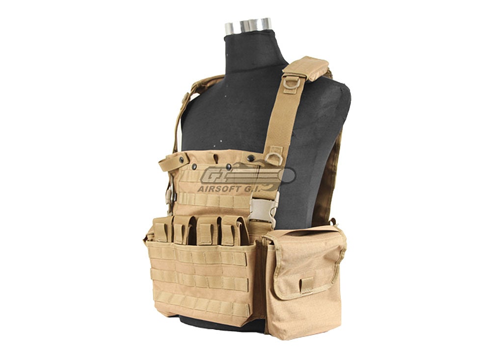 The CP-6 Combat MPS Chest Rig is essentially an H-harness vest that features magazine pouches and two large multi-purpose pouches that are already built into the vest. The CP-6 Rig also has an "X harness" feature which allows the rear plate carrier to be removed, allowing the wearer to wear a separate vest or plate carrier underneath.