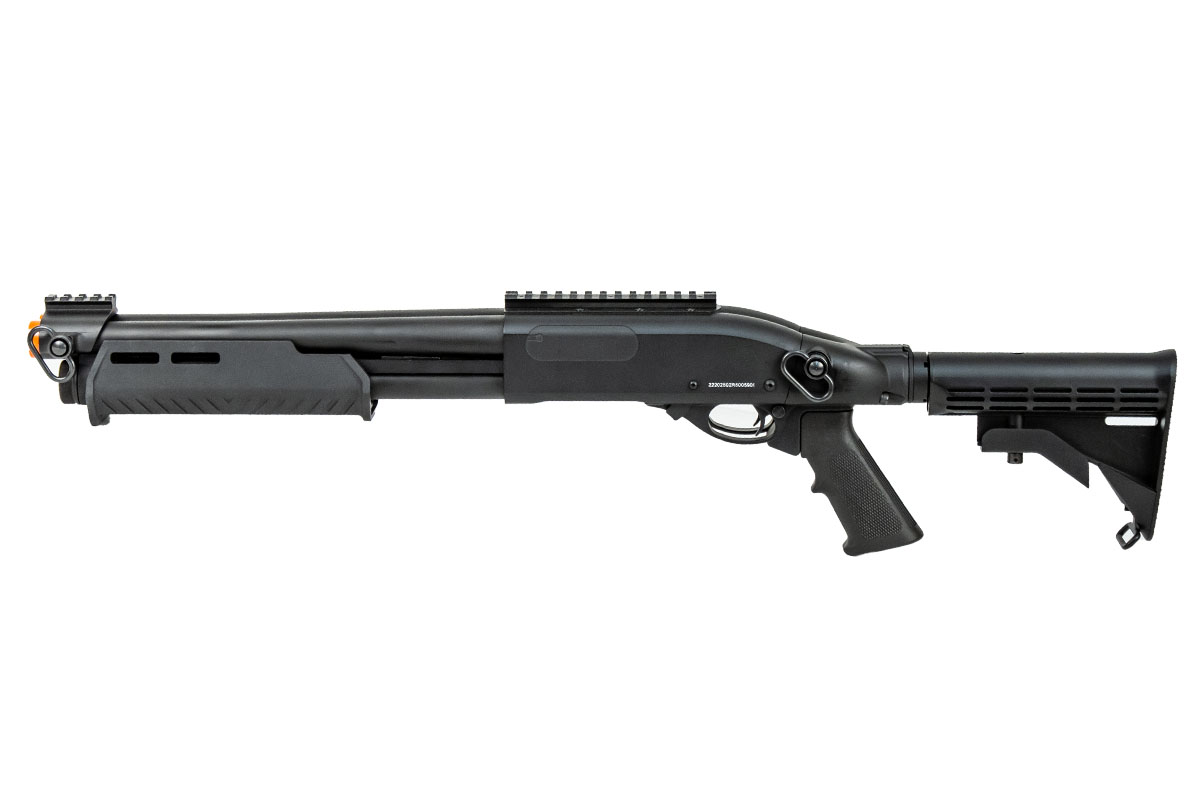 With the double barrel system, this all metal shotgun is capable of firing between three, six, and nine BB's at one time by manipulating a switch near the ejection port for each barrel. Each individual barrel has three inner barrels with fixed hop up units, giving you great CQB range as well as a decent amount of BB spread. The shotgun features a removable gas tank located inside the butt stock of the airsoft gun. The shotgun is compatible with any TM 30 round style shell, and the 30 round shells used for UTG Spring Shotguns, which is predominately used in M3 style triburst shotguns. One major advantage that a gas shotgun has over a spring shotgun is the ease in which it takes to cock the gun. Without a spring needing to be compressed, the hand guard moves almost effortlessly for speedy followup shots. In addition, the realism in both operation and sound is unparalleled in gas shotguns.Specifications: